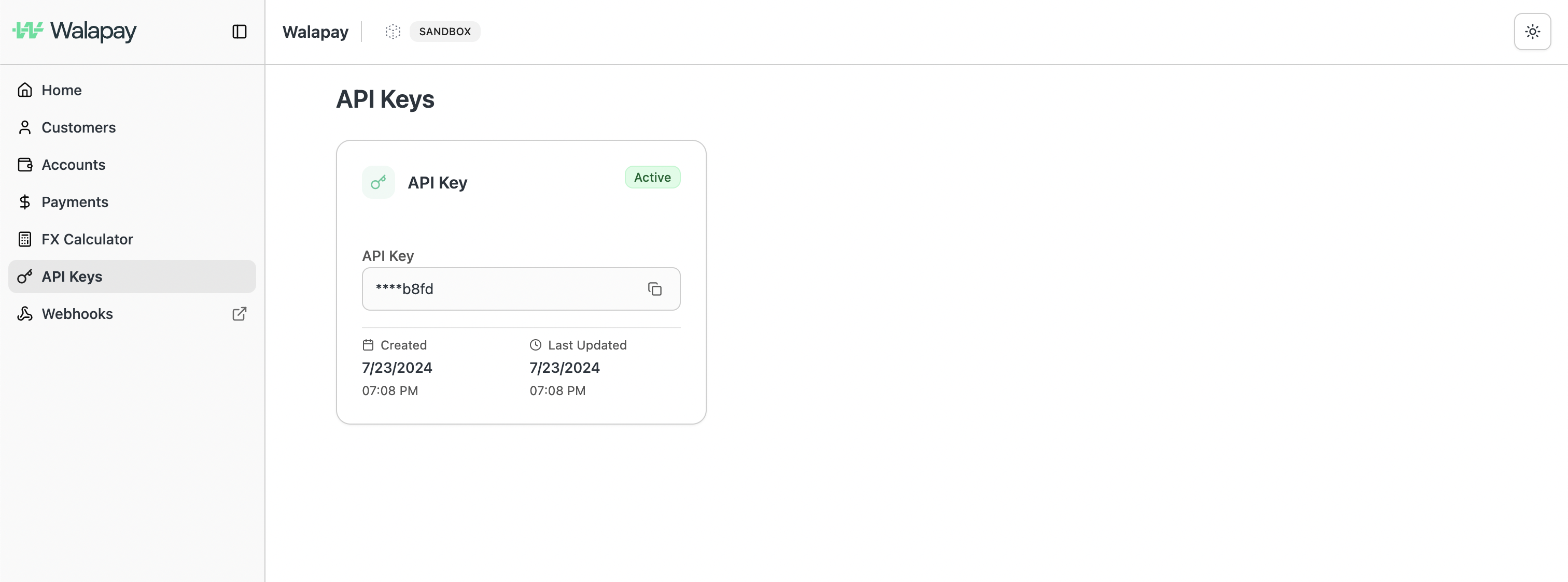 Once you’ve submitted your KYB package, you will receive Sandbox Environment access (if conditionally approved by the Walapay team). Navigate to the API Management tab on your dashboard to find your Sandbox key.