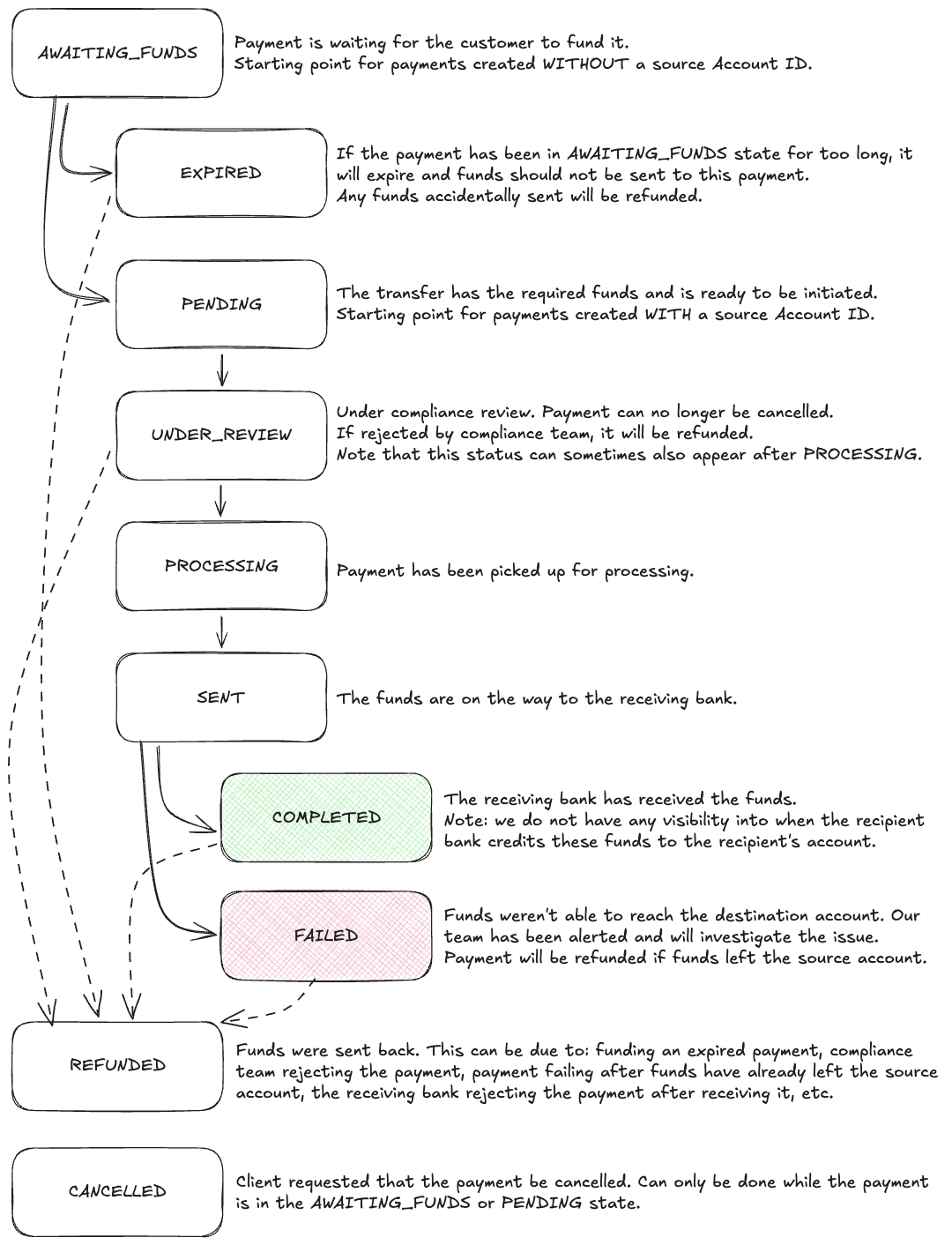 - Completed status: If the payment is to a bank account, we do not have visibility passed the receiving bank accepting the funds. If a customer cannot see their funds for a completed payment, they should contact their bank to understand why the funds have not yet been credited to their account.
